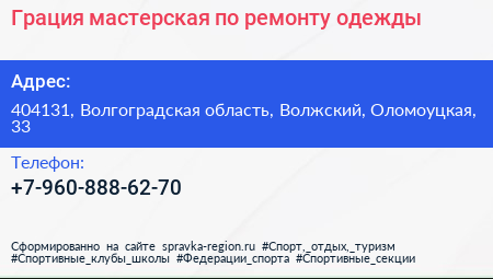 Грация, мастерская по ремонту одежды по адресу 404131, Волгоградская область, Волжский, Оломоуцкая, 33 в дальнейшем Организация, размещена в следующих категориях: