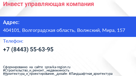 Инвест, управляющая компания по адресу 404101, Волгоградская область, Волжский, Мира, 157 в дальнейшем Организация, размещена в следующих категориях: