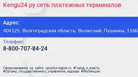 Kengu24.ру, сеть платежных терминалов по адресу 404125, Волгоградская область, Волжский, Пушкина, 116Б в дальнейшем Организация, размещена в следующих категориях: