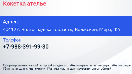 Кокетка, ателье по адресу 404127, Волгоградская область, Волжский, Мира, 42г в дальнейшем Организация, размещена в следующих категориях: