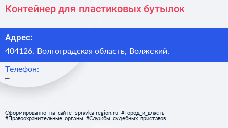 Контейнер для пластиковых бутылок по адресу 404126, Волгоградская область, Волжский, в дальнейшем Организация, размещена в следующих категориях: