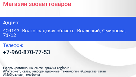 Магазин зооветтоваров по адресу 404143, Волгоградская область, Волжский, Смирнова, 71/12 в дальнейшем Организация, размещена в следующих категориях: