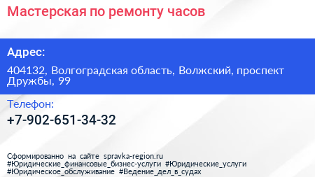 Мастерская по ремонту часов по адресу 404132, Волгоградская область, Волжский, проспект Дружбы, 99 в дальнейшем Организация, размещена в следующих категориях: