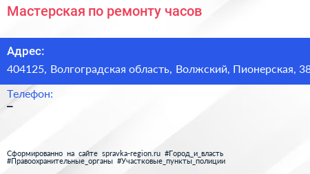 Мастерская по ремонту часов по адресу 404125, Волгоградская область, Волжский, Пионерская, 38 в дальнейшем Организация, размещена в следующих категориях: