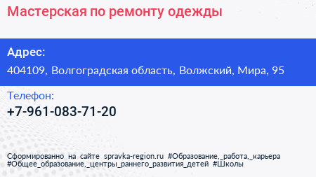 Мастерская по ремонту одежды по адресу 404109, Волгоградская область, Волжский, Мира, 95 в дальнейшем Организация, размещена в следующих категориях: