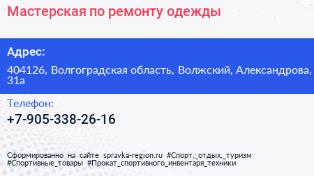 Мастерская по ремонту одежды по адресу 404126, Волгоградская область, Волжский, Александрова, 31а в дальнейшем Организация, размещена в следующих категориях: