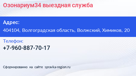 Озонариум34, выездная служба по адресу 404104, Волгоградская область, Волжский, Химиков, 20 в дальнейшем Организация, размещена в следующих категориях:
