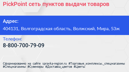 PickPoint, сеть пунктов выдачи товаров по адресу 404131, Волгоградская область, Волжский, Мира, 53ж в дальнейшем Организация, размещена в следующих категориях: