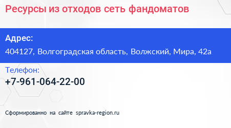 Ресурсы из отходов, сеть фандоматов по адресу 404127, Волгоградская область, Волжский, Мира, 42а в дальнейшем Организация, размещена в следующих категориях: