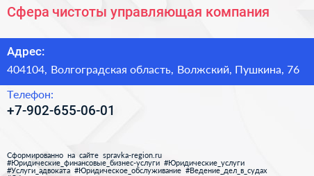 Сфера чистоты, управляющая компания по адресу 404104, Волгоградская область, Волжский, Пушкина, 76 в дальнейшем Организация, размещена в следующих категориях: