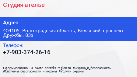 Студия-ателье по адресу 404105, Волгоградская область, Волжский, проспект Дружбы, 83а в дальнейшем Организация, размещена в следующих категориях: