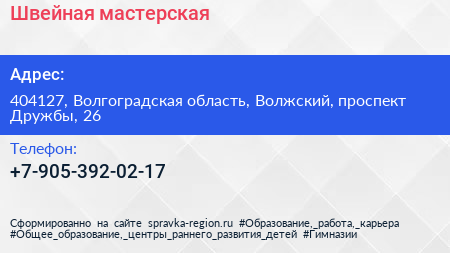 Швейная мастерская по адресу 404127, Волгоградская область, Волжский, проспект Дружбы, 26 в дальнейшем Организация, размещена в следующих категориях:
