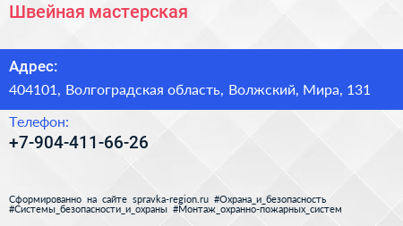 Швейная мастерская по адресу 404101, Волгоградская область, Волжский, Мира, 131 в дальнейшем Организация, размещена в следующих категориях: