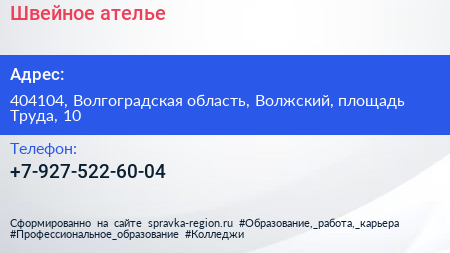 Швейное ателье по адресу 404104, Волгоградская область, Волжский, площадь Труда, 10 в дальнейшем Организация, размещена в следующих категориях: