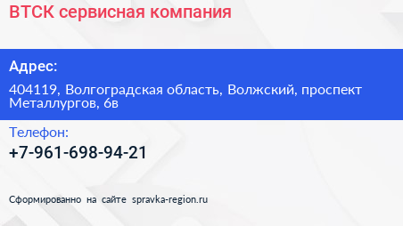 ВТСК, сервисная компания по адресу 404119, Волгоградская область, Волжский, проспект Металлургов, 6в в дальнейшем Организация, размещена в следующих категориях: