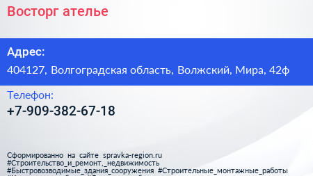 Восторг, ателье по адресу 404127, Волгоградская область, Волжский, Мира, 42ф в дальнейшем Организация, размещена в следующих категориях: