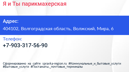 Я и Ты, парикмахерская по адресу 404102, Волгоградская область, Волжский, Мира, 6 в дальнейшем Организация, размещена в следующих категориях:
