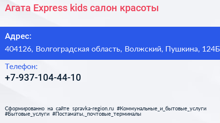 Агата Express kids, салон красоты по адресу 404126, Волгоградская область, Волжский, Пушкина, 124Б в дальнейшем Организация, размещена в следующих категориях: