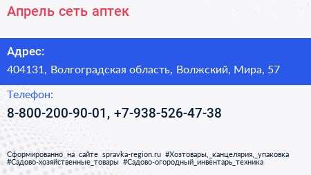 Апрель, сеть аптек по адресу 404131, Волгоградская область, Волжский, Мира, 57 в дальнейшем Организация, размещена в следующих категориях: