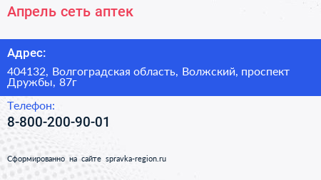 Апрель, сеть аптек по адресу 404132, Волгоградская область, Волжский, проспект Дружбы, 87г в дальнейшем Организация, размещена в следующих категориях: