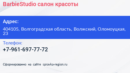 BarbieStudio, салон красоты по адресу 404105, Волгоградская область, Волжский, Оломоуцкая, 23 в дальнейшем Организация, размещена в следующих категориях: