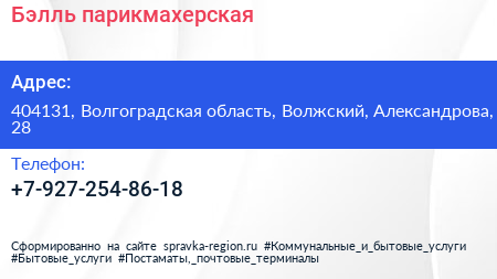 Бэлль, парикмахерская по адресу 404131, Волгоградская область, Волжский, Александрова, 28 в дальнейшем Организация, размещена в следующих категориях: