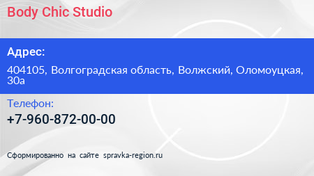 Body Chic Studio по адресу 404105, Волгоградская область, Волжский, Оломоуцкая, 30а в дальнейшем Организация, размещена в следующих категориях: