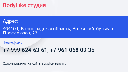 BodyLike, студия по адресу 404104, Волгоградская область, Волжский, бульвар Профсоюзов, 23 в дальнейшем Организация, размещена в следующих категориях: