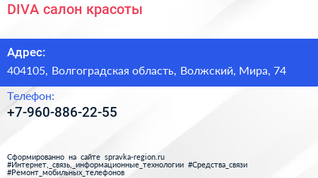 DIVA, салон красоты по адресу 404105, Волгоградская область, Волжский, Мира, 74 в дальнейшем Организация, размещена в следующих категориях: