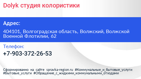 Dolyk, студия колористики по адресу 404101, Волгоградская область, Волжский, Волжской Военной Флотилии, 62 в дальнейшем Организация, размещена в следующих категориях: