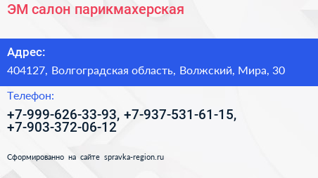 ЭМ, салон-парикмахерская по адресу 404127, Волгоградская область, Волжский, Мира, 30 в дальнейшем Организация, размещена в следующих категориях: