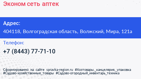Эконом, сеть аптек по адресу 404118, Волгоградская область, Волжский, Мира, 121а в дальнейшем Организация, размещена в следующих категориях: