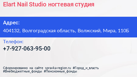 Elart Nail Studio, ногтевая студия по адресу 404132, Волгоградская область, Волжский, Мира, 110Б в дальнейшем Организация, размещена в следующих категориях: