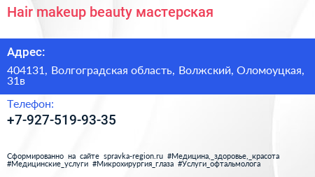 Hair makeup beauty, мастерская по адресу 404131, Волгоградская область, Волжский, Оломоуцкая, 31в в дальнейшем Организация, размещена в следующих категориях: