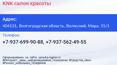 KNK, салон красоты по адресу 404131, Волгоградская область, Волжский, Мира, 55/1 в дальнейшем Организация, размещена в следующих категориях: