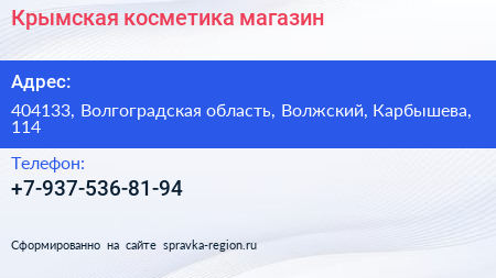 Крымская косметика, магазин по адресу 404133, Волгоградская область, Волжский, Карбышева, 114 в дальнейшем Организация, размещена в следующих категориях: