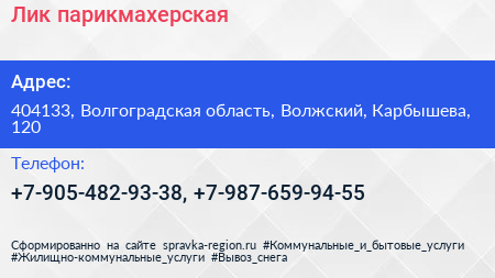 Лик, парикмахерская по адресу 404133, Волгоградская область, Волжский, Карбышева, 120 в дальнейшем Организация, размещена в следующих категориях: