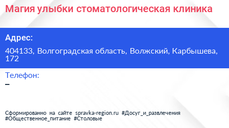 Магия улыбки, стоматологическая клиника по адресу 404133, Волгоградская область, Волжский, Карбышева, 172 в дальнейшем Организация, размещена в следующих категориях: