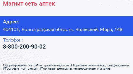 Магнит, сеть аптек по адресу 404101, Волгоградская область, Волжский, Мира, 148 в дальнейшем Организация, размещена в следующих категориях: