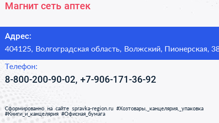 Магнит, сеть аптек по адресу 404125, Волгоградская область, Волжский, Пионерская, 38 в дальнейшем Организация, размещена в следующих категориях: