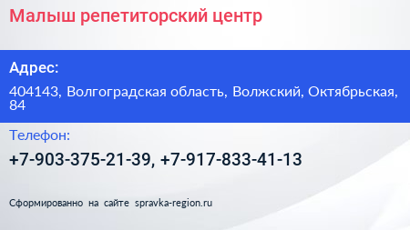 Малыш, репетиторский центр по адресу 404143, Волгоградская область, Волжский, Октябрьская, 84 в дальнейшем Организация, размещена в следующих категориях: