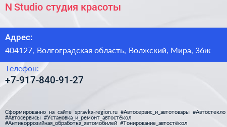 N-Studio, студия красоты по адресу 404127, Волгоградская область, Волжский, Мира, 36ж в дальнейшем Организация, размещена в следующих категориях: