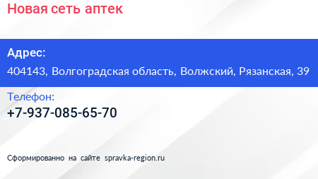 Новая, сеть аптек по адресу 404143, Волгоградская область, Волжский, Рязанская, 39 в дальнейшем Организация, размещена в следующих категориях: