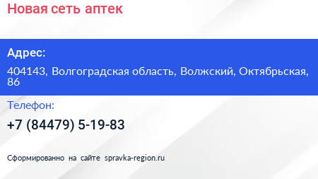 Новая, сеть аптек по адресу 404143, Волгоградская область, Волжский, Октябрьская, 86 в дальнейшем Организация, размещена в следующих категориях: