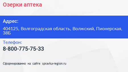 Озерки, аптека по адресу 404125, Волгоградская область, Волжский, Пионерская, 38Б в дальнейшем Организация, размещена в следующих категориях: