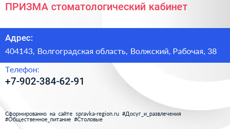 ПРИЗМА, стоматологический кабинет по адресу 404143, Волгоградская область, Волжский, Рабочая, 38 в дальнейшем Организация, размещена в следующих категориях:
