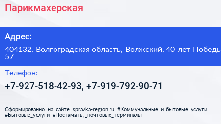 Парикмахерская по адресу 404132, Волгоградская область, Волжский, 40 лет Победы, 57 в дальнейшем Организация, размещена в следующих категориях: