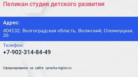 Пеликан, студия детского развития по адресу 404132, Волгоградская область, Волжский, Оломоуцкая, 26 в дальнейшем Организация, размещена в следующих категориях: