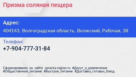 Призма, соляная пещера по адресу 404143, Волгоградская область, Волжский, Рабочая, 38 в дальнейшем Организация, размещена в следующих категориях: