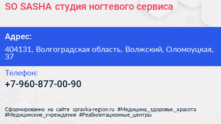 SO SASHA, студия ногтевого сервиса по адресу 404131, Волгоградская область, Волжский, Оломоуцкая, 37 в дальнейшем Организация, размещена в следующих категориях: